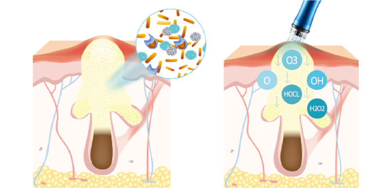 자극없이 사멸 시켜 여드름을 억제하고 오존은 일정 시간이 지나면